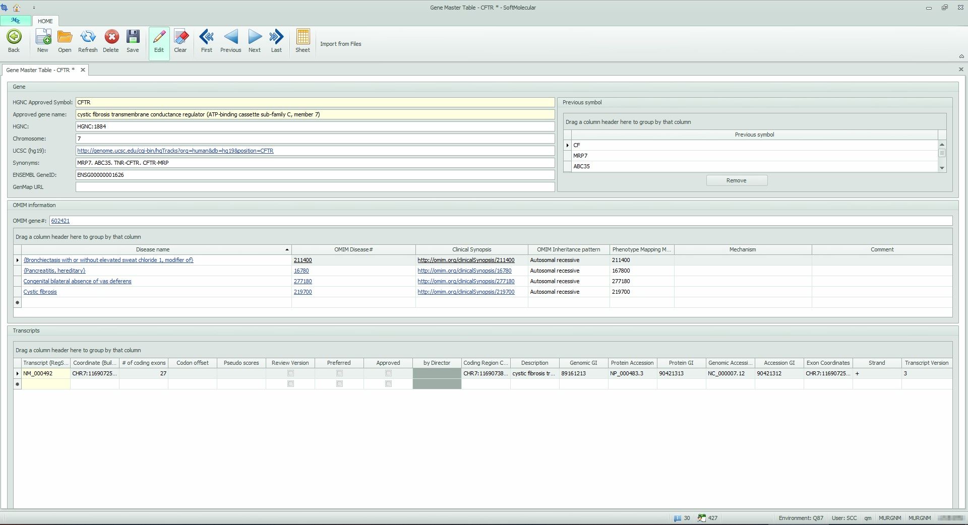 SoftMolecular supports the generation of variant databases by categorizing variants, creating versions, and linking to relevant databases like NCBI and OMIM. This feature facilitates the entry, management, and interpretation of variants. It also allows users to capture variant information from internal databases as well as hyperlinks that connect to external databases via the internet. This capability allows users to view reference material that contributed to interpretations at the single-gene level. SoftMolecular also provides versioning of genetic information, which allows users to track the source material used for an interpretation when new information affects the interpretation or variant category.