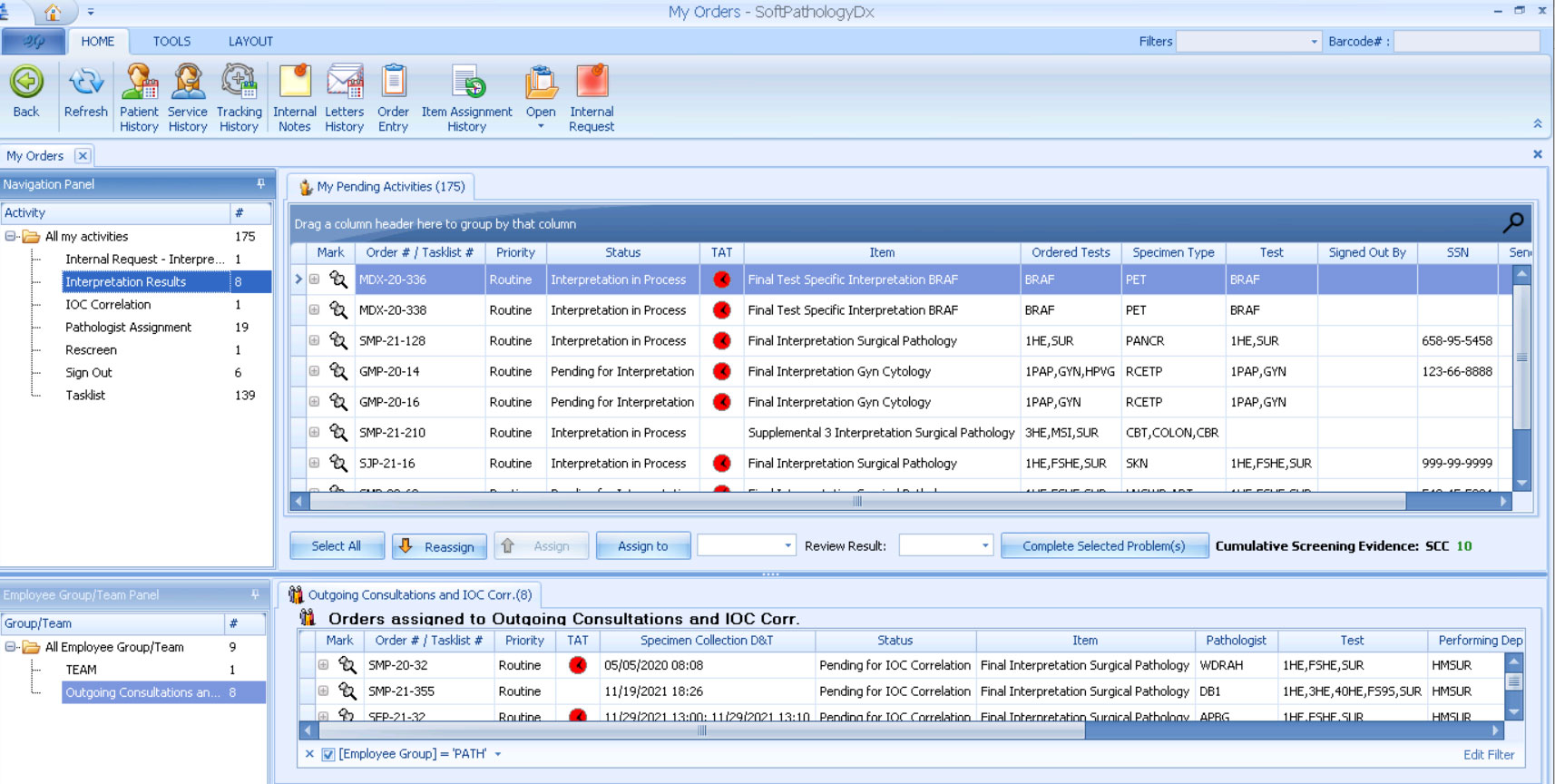 The SoftPathDx Pathologist Dashboard allows pathologists to review their workload of assigned orders, including those that aren’t yet ready for interpretation. This dashboard also displays intra-departmental consultations, reviews, sign-outs, and IOC correlation, along with the number of orders qualifying for each of these pending activities. This feature allows pathologists to plan ahead by reviewing the number of pending cases. In addition, pathologists can use their dashboard to assign their orders to other pathologists or pathologist groups. Users can also customize the Pathologist Dashboard to ensure the pathologist can view desired data.